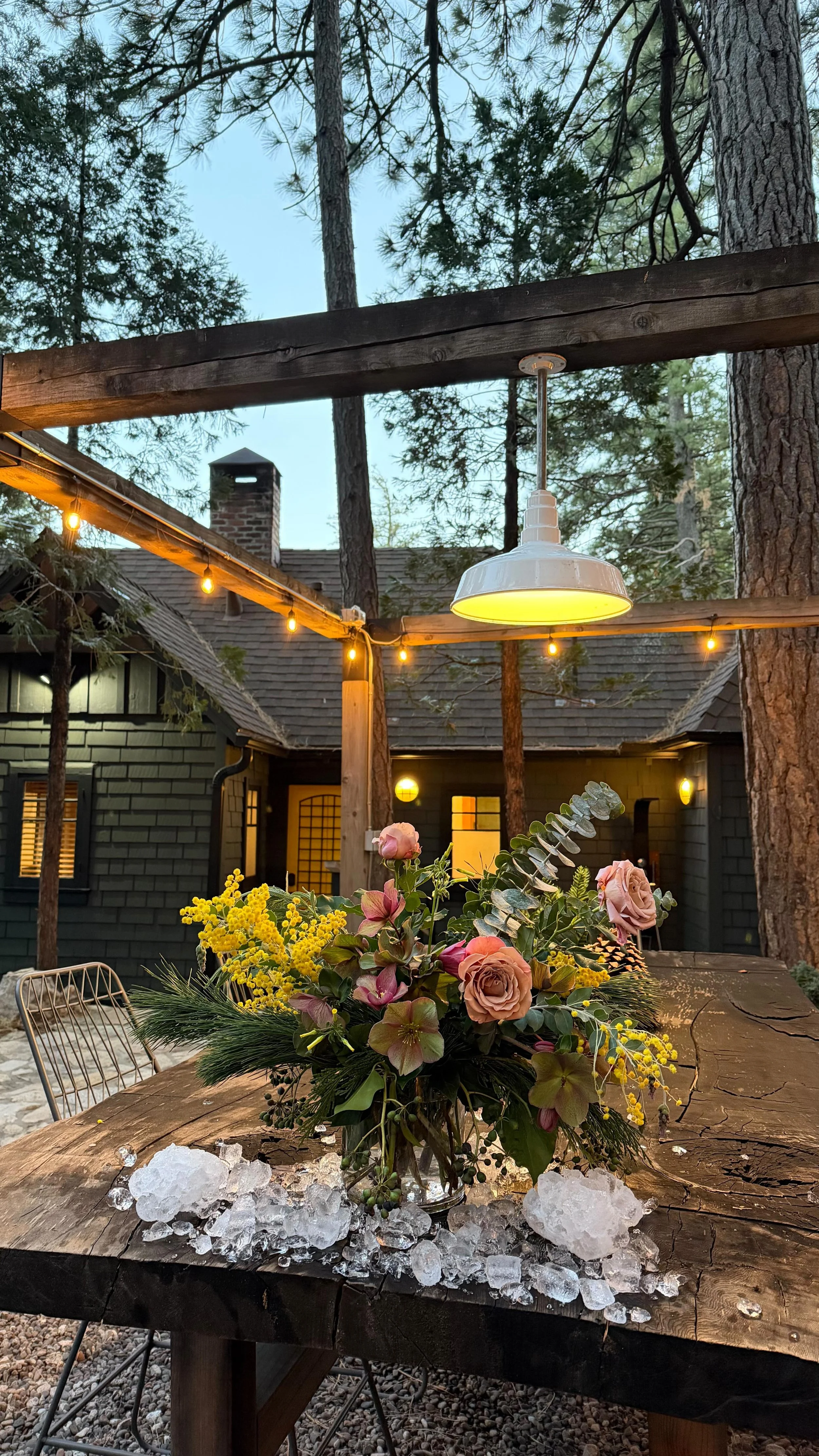 Enjoy the fresh mountain air, towering evergreens, and a summer camp vibe with the outdoor space right of the level driveway. Outdoor pergola with market lights and dining table, lounge area with gas fire-pit and Adirondack chairs, softly lit steps up to multiple area such as the kids picnic table, hot tub, and A-Frame.