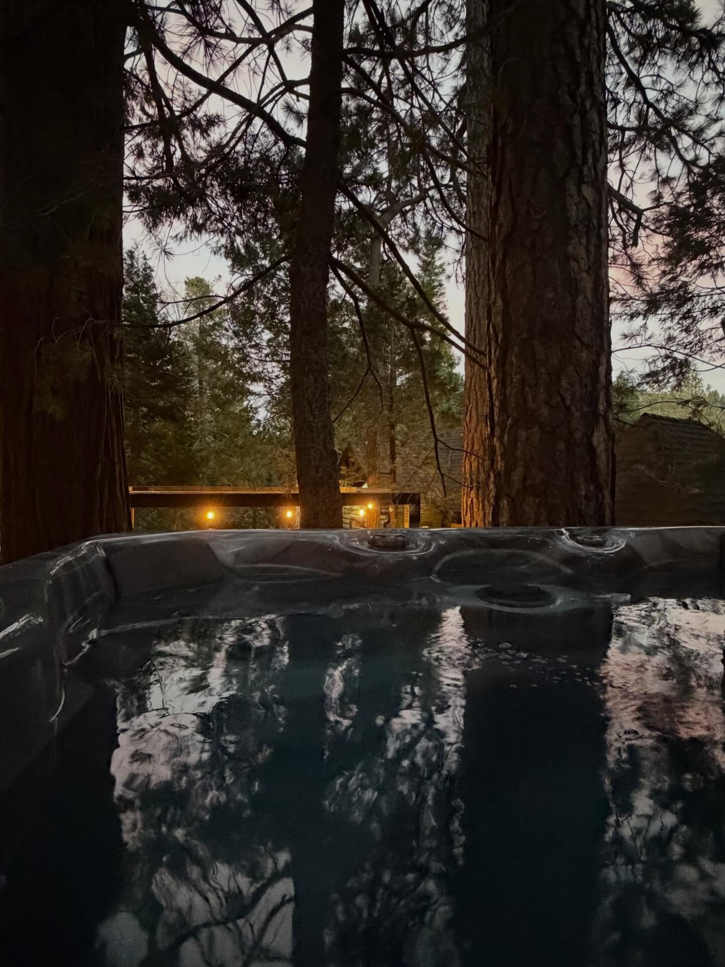 Single-story cabin just a few steps down from level parking area with EV charger. Modern amenities such as fully stocked gourmet kitchen with premium espresso machine and organic spices and oils. Luxuious spa-like bathroom with filtered shower head, Aesop bath products, and hotel style plush white bath towels.
